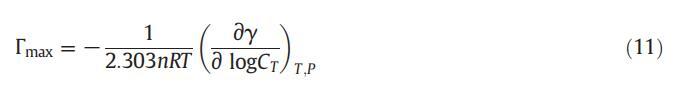 借助吉布斯吸附方程,我们可以使用公式(11)[62]计算表面活性剂在空气-溶液界面的最大吸附量: