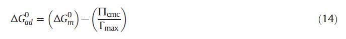 式(14)中的术语ð∏cmcΓmaxÞ为我们提供了将单层表面压力为零的两亲分子引入胶束所需的工作信息。ΔGm0和ΔGad 0的值均为负值,表明这两个过程都是有利的,但是ΔGad 0的值比ΔGm0的值更为负,这表明所有这些系统的吸附过程比胶束形成过程更为有利。