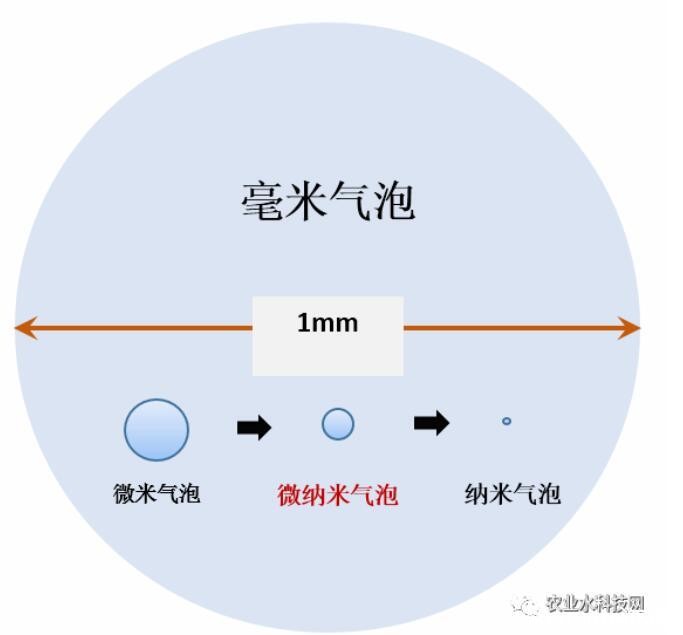 通常我们把气体在液体中的存在现象称作气泡。气泡的形成现象,在自然界中的许多过程中都能遇到,当气体在液体中受到剪切力的作用时就会形成大小、形状各不相同的气泡。目前,对气泡的分类与定义并不是十分严格,按照从大到小的顺序可分为厘米气泡(CMB)、毫米气泡(MMB)、微米气泡(MB)、微纳米气泡(MNB)、纳米气泡(NB)。所谓的微纳米气泡,指在发生时,直径在1-50微米的气泡为微米气泡,直径1微米以下的气泡为纳米级气泡,两者统称为微纳米气泡。在水中通常外观表现为乳白色。