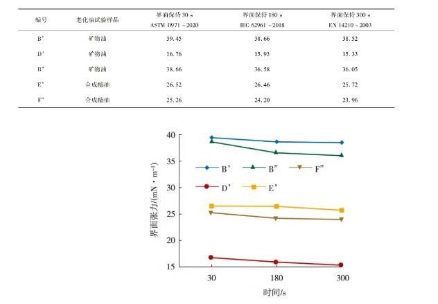 IEC62961:2018方法介于ASTMD971方法和EN14210方法之间,在界面形成180s时测量界面张力更加符合实际,同时测量时间对测量结果影响较小。从图3和图4也可以看出,老化油的界面张力随时间变化较为明显,主要表现在界面张力曲线从30s到180s的变化斜率较大,而在界面形成的180s时测量界面张力数值与300s的测量数据很接近,可以提供一个较为真实的界面张力值,并且检测时间相对较短。