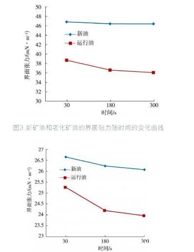 图3新矿油和老化矿油的界面张力随时间的变化曲线