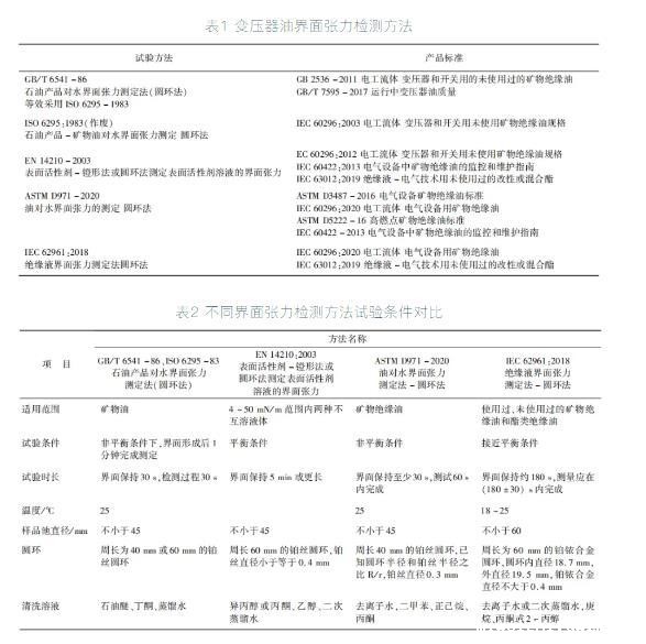 方法:不同产品标准所采用的界面张力检测方法不同,具体如表1和2所示。可以看出,各方法的测量原理相同,测定绝缘油的界面张力的方法大都采用的是圆环法,主要区别就是界面形成后即非平衡条件、接近平衡条件及平衡条件下测试的保持时间不同。