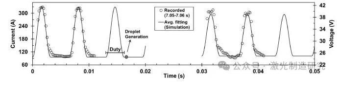 其中,I 1、I 2和P d分别是背景电流、脉冲电流和总波形的脉冲占空比,模拟电流和电压的相关波形如图7所示。记录的每个电极的平均功率为4957 J/s,与模拟的平均功率4740 J/s相比,证实了该模型在5%误差内的准确性。在整个模拟时间内,一旦脉冲在每个周期结束,液滴产生时间就与波形同步。