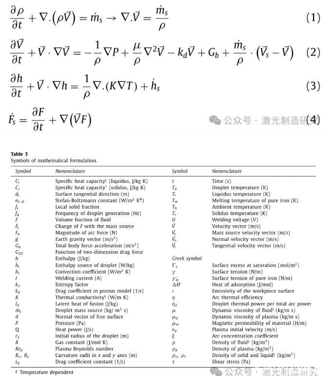 其中xc和yc是电弧中心的移动坐标,V w表示焊接速度。请注意,前电极和后电极遵循x方向前后的反向后缀。焊接过程中,熔池的上表面与电弧压力和等离子体射流产生的应力相互作用。电弧等离子体的电磁力产生的压力梯度沿着自由表面的法线方向产生向下的电离气体流。此外,等离子射流冲击自由表面在熔池中产生向外的流动。存在表面张力时,使用牛顿粘度定律的压力边界条件表示如下: