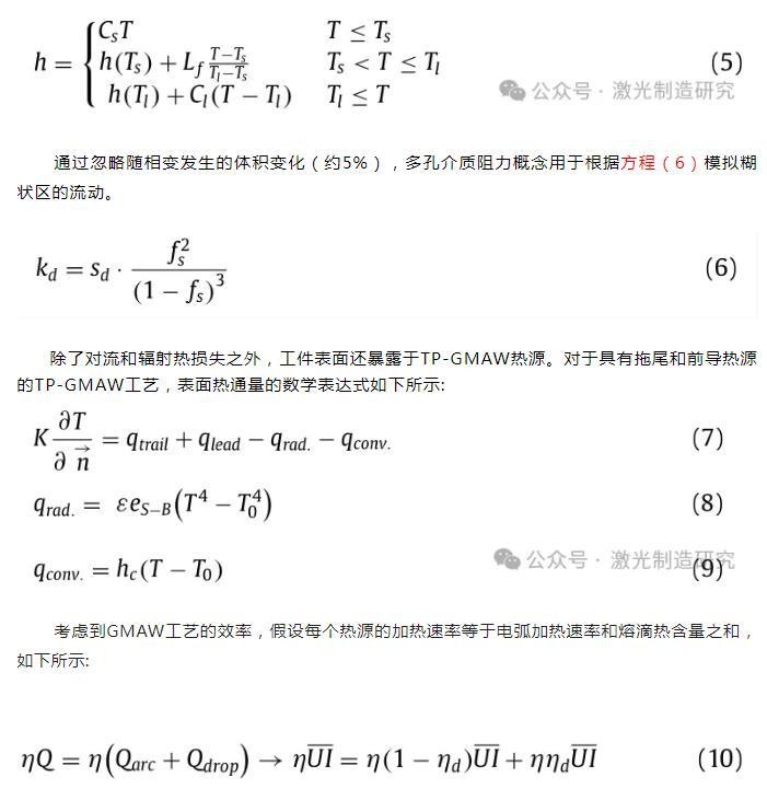 除了对流和辐射热损失之外,工件表面还暴露于TP-GMAW热源。对于具有拖尾和前导热源的TP-GMAW工艺,表面热通量的数学表达式如下所示: