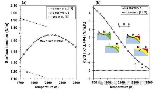 如图6所示,表面张力梯度的符号在较高温度下从负值变为较低温度下的正值。硫含量可以根据两种情况下获得的约44%的稀释度来近似计算。在本研究中,认为平均硫含量为0.028 wt%,分别对应于基底金属和填料含量0.018和0.035 wt%。图6(b)说明了瞬态温度和马兰戈尼流的重要性。