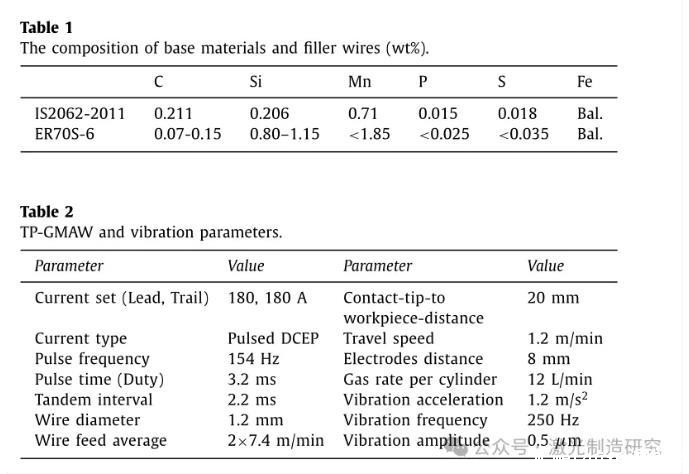 在IIT海得拉巴使用机器人TP-GMAW设施进行焊接实验,其中两个电极分别通过焊枪馈送并从两个独立的电源接收电力。电源以反相方式同步,以防止后电弧和前电弧之间的相互作用。氩气82%–二氧化碳18%用作保护气体。机器人焊接设备由KUKA公司的KR30六轴机器人组成,该机器人与Fronius公司的两个数字焊接电源相连。跟踪电极和引导电极的电流设置为180 A.通过保持焊枪垂直于工件,在平面位置进行长度为200 mm的堆焊。本研究中使用的基材是由铁素体-珠光体结构组成的热轧低碳钢IS 2062-2011。丝状电极是直径为1.2毫米的ER 70-S。母材和焊丝的化学成分列于表1。使用容量为150±0 kgf的Sdyn电动振动机来产生振动。