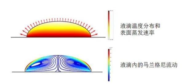 -液滴蒸发过程:液滴在蒸发过程中,边缘处的溶质浓度增加或温度下降可能导致表面张力增大,形成向中心的马兰格尼流,影响蒸发速率和液滴形态演化。
