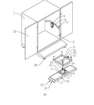 参照图2和图3,调平结构包括调节板7、齿轮一8、齿轮二9和用于驱动齿轮二9转动的旋钮10,调节板7转动连接于壳体1内,壳体1上开设有供调节板7移动的滑槽11,调节板7的底面呈弧形凹面12设置且弧形凹面12上开设有齿槽13,调节板7顶面的两侧边倒有倒角23;齿轮一8和齿槽13啮合;齿轮一8和齿轮二9均转动连接于壳体1上,齿轮一8和齿轮二9啮合,齿轮二9的齿数小于齿轮一8的齿数,从而达到一个减速的作用,旋钮10设置于壳体1外。