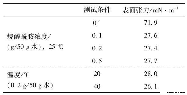 某学生自制烷醇酰胺不同测试下表面张力测试值,如表1所示。合成的烷醇酰胺具有较强的表面活性。25℃下纯水表面张力为71.9℃mN/m。当50 g水中加入0.1 g烷醇酰胺时,其表面张力显著降低,为27.6 mN/m。当增至0.2 g时达到最低值(27.4 mN/m),继续增加,反而略有增加。上述结果表明,0.2 g烷醇酰胺加入量已达到其CMC浓度。同样,在最佳浓度下(0.2 g/50 g水),随着测试温度的升高,烷醇酰胺水溶液表面张力降低。