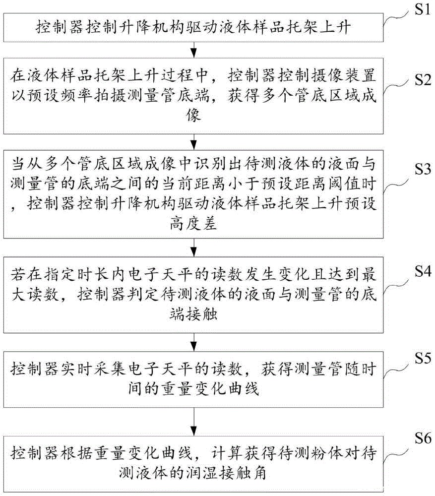 为此,现有技术中提出一些理论,即可选择润湿过程中在各个时间段测量粉体床内液体质量,从而得出质量对时间的变化,求取液体对固态粉体的接触角。但是,每次称重测量时,需要将样品测量管提出液面并擦去连带的水分,操作比较繁琐,且无法精确控制每次擦除的液体量,造成了称重测量过程中的不连贯性,也会使得结果误差放大。