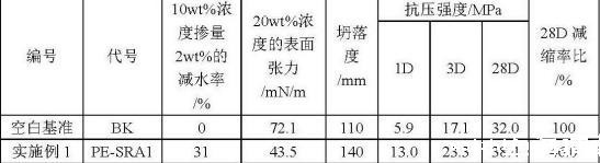 按上面步骤制备的减水剂进行配比,采用基准水泥或者代用的工程普通水泥,砂率39wt%,配合比(质量比)为水泥:砂子:碎石=330:720:1100,PE±SRA减水剂10wt%浓度掺量2wt%,通过调整用水量控制混凝土坍落度在90-145mm,检测后得知,PE-SRA系列与PE+SRA系列的表面张力相近,但相同掺量条件下PE-SRA系列的减水率和减缩效果远远好于PE+SRA系列。