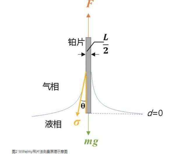 Wilhelmy吊片法测定液气界面张力是基于垂直悬浮在界面中的铂片上的拉力、表面张力、重力和浮力之间的平衡作用(如图2所示):