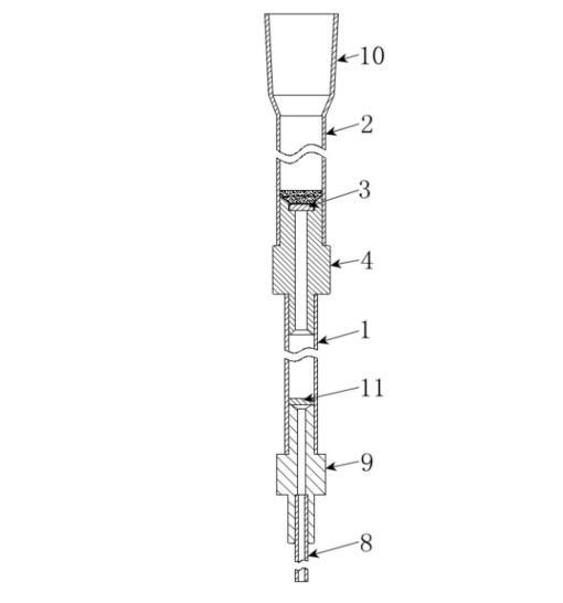 1、填料管;2、柱头管;3、第一亲水筛板;4、第一连接接头;5、中部连接部;6、顶部连接部;7、底部连接部;8、适配管;9、第二连接接头;10、加液口;11、第二亲水筛板。