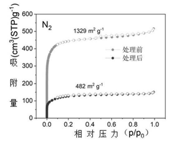 步骤1所用活性碳纤维以及本实施例制备得到的高能量转化效率的碳材料的氮气吸脱附测试可以看出:制备前活性碳纤维的氮气吸脱附测出比表面积为1329m2/g,经过处理,比表面积降至482m2/g,说明蒽在孔内的沉积改变了孔的结构,减小了孔容,孔腹尺寸被收缩;