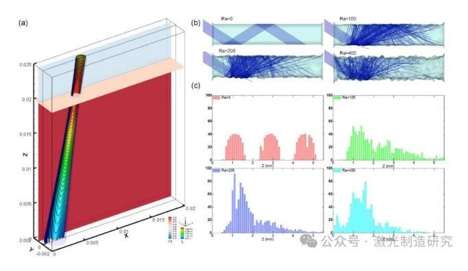图1.(A)计算区域和高斯热源分布示意图;(B)不同表面粗糙度下激光光线追踪模型的验证;(C)不同表面粗糙度下的反射点分布。