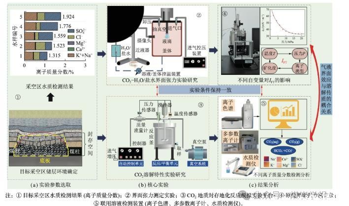 采空区CO2封存作为解决煤炭行业碳排放难题的重要负碳技术储备,在采空区废弃资源二次利用、CO2封存等方面具有广泛的应用前景。利用原位界面张力测定仪开展了不同温压、地层水矿化度及阳离子溶液类型对CO2地层水系统的界面张力(IFT)影响规律实验,明晰了CO2注入含水碎胀煤岩体中的气液界面扩散效应,并将基于统计缔合理论结合兰纳−琼斯势能模型的状态方程(SAFT-LJ状态方程)与密度梯度理论(DGT)结合预测了IFT理论值;利用自主研发的地质封存地化反应模拟实验平台对相同条件下的CO2溶解性进行了探究实验,得到了采空区储层环境下CO2溶解度变化特征,采用D-S模型计算了对应CO2溶解度理论值。