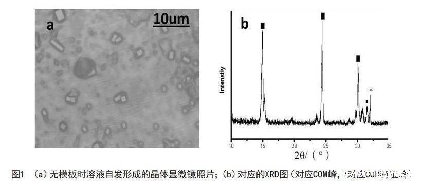 采用XRD表征草酸钙的成分;收集在十八胺LB膜上的晶体和溶液自发生成的晶体,用金相显微镜表征。