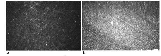 利用BAM研究了DEAE-琼脂糖单分子膜的成膜过程,图4为表面压为0 mN/m和34 mN/m的BAM图像结果。通过对BAM图像的观测,可以看出其成膜过程,确定其是否成膜。图4-a为DEAE-琼脂糖刚滴加在亚相上的BAM图像,分子被平铺在亚相表面,相对分散,呈气相状态,此时布鲁斯特角的折射不受表面分子影像,图像颜色较深,看不出分子的具体形态。待其挥发一定时间后,随着滑障的持续压缩,DEAE-琼脂糖由分散状态到聚集成膜,最后在亚相上形成相对稳定的固相区域。图4-b为固相状态下的DEAE-琼脂糖单分子膜,可以看出此时分子之间排列紧密,分子间距较小,已经形成固相状态。由于分子在亚相表面紧密排列形成了单分子层,改变了布鲁斯特角的折射,使得图像的颜色变浅。通过对表面压为0 mN/m和34 mN/m的BAM图像对比可以看出,DEAE-琼脂糖分子由一开始的分散状态到达最后稳定的固相状态,成功形成了稳定的便于提拉的单分子层。