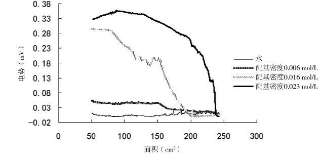 利用表面电势分析仪研究了不同配基密度对LB膜表面电势的影响,图5为不同配基密度DEAE-琼脂糖LB膜表面电势图像。结果表明随着配基密度的增加其表面电势不断增加,LB膜性质越稳定。