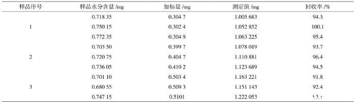 在样品中加入精密称取的标准水加标水平分别为0.3 mg、0.4 mg、0.5 mg,在150℃加热10 min的测定条件下,采用滴定度为1 mg/mL的费休氏试剂,每个加标水平重复测定3次,经测定,加标回收率在91.8%~100.1%,结果见表6。
