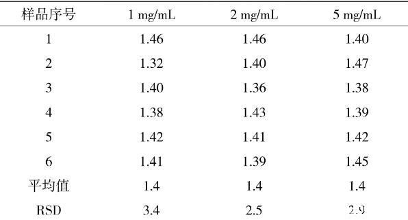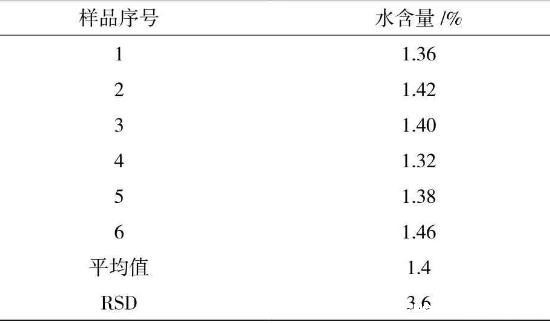 在150℃加热10 min的测定条件下,采用滴定度为1 mg/mL的费休氏试剂,用卡氏干燥炉自动进样法测定样品中水分含量,样品测定6次,计算6次结果的相对标准偏差(RSD%)数据见表5。结果表明测定结果具有良好的重复性。