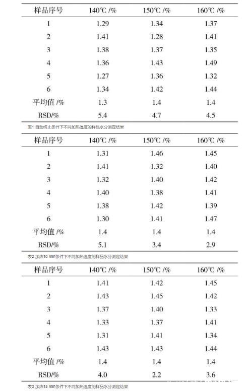 表1自动终止条件下不同加热温度的样品水分测定结果