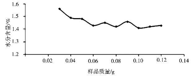 在150℃加热10 min的测定条件下,样品称样量也会对测定结果有影响[4]。分别称取0.03g、0.04g、0.05g、0.06g、0.07g、0.08g、0.09 g、0.10g、0.11g、0.12g的样品质量,考察样品称样量对测定结果的影响,结果见图1。从图中可以看出,仪器测得样品水分含量随着加入样品质量的增大逐渐趋于稳定,当单次加入的样品质量较小时,测得结果偏高[5]。称量样品质量在50~120 mg结果无明显差异。