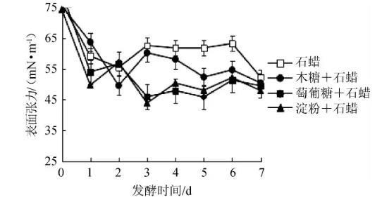 分别在不同碳源(石蜡2 g/L、木糖2 g/L+石蜡2 g/L、葡萄糖2 g/L+石蜡2 g/L、淀粉2 g/L+石蜡2 g/L)的发酵培养基接入5%液体种子,60℃静置培养7 d。每天定时取样测定发酵液的菌体密度(OD600nm值),上清液的表面张力、乳化活性及石蜡的含量。