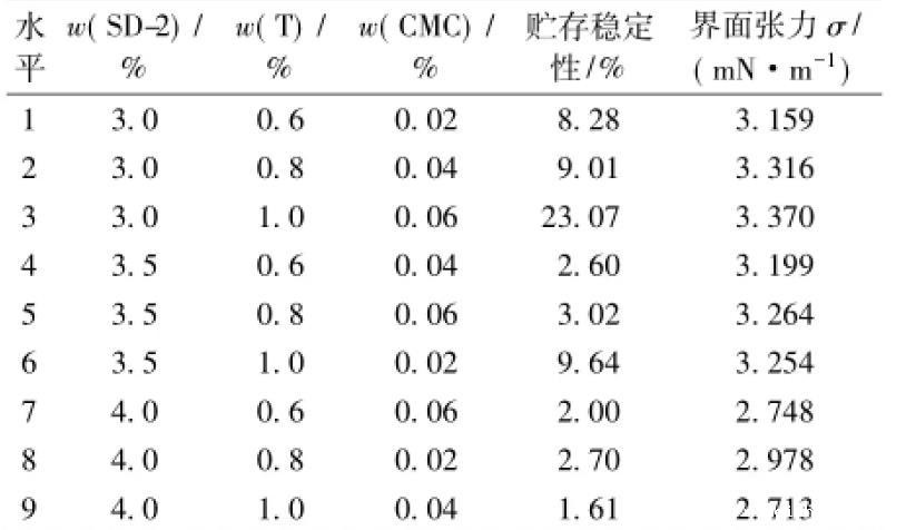 乳化剂SD-2,缔合型增稠剂T和羧甲基纤维钠等是CA砂浆阴离子乳化沥青中最关键的3种组分,对乳化沥青的性能起着决定性的影响。为了比较对油水界面张力和乳化沥青贮存稳定性的影响,采用L9(34)正交试验的方法进行优化设计,因素水平见表1。