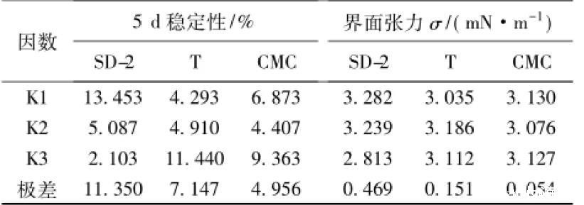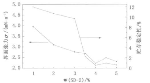 从分子结构上来看,羧甲基纤维钠也属于表面活性剂的范畴,具有一定的乳化能力。因此,羧甲基纤维素钠与乳化剂SD-2具有较好的协同效应,在较低的质量分数时就能够显著降低界面张力值,改善乳液的贮存稳定性。