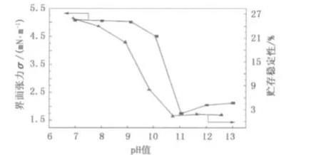 图2皂液pH值对界面张力和贮存稳定性界面张力的影响