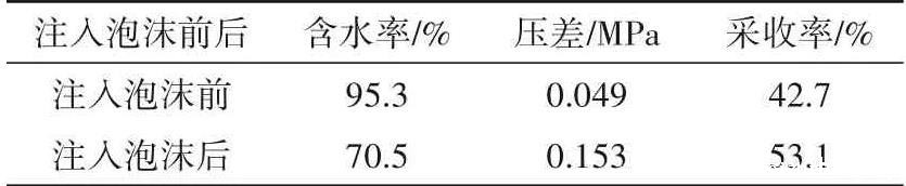 由表1可知:在注入泡沫前,采出液的含水率达到95.3%,在向胶结岩心中注入0.3 PV的泡沫流体后含水率显著下降到70.5%,注入泡沫流体前后压差达0.104 MPa,说明AUDB型起泡剂混合氮气形成的泡沫具有良好的封堵效果。注入泡沫流体后,采收率明显提高,由42.7%提高至53.1%,说明AUDB型起泡剂具有良好的洗油效果。
