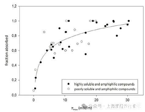 图5、两亲性化合物的πmax(表面压力)与PMPAM膜的表观渗透率相关性。从图中可以看出七个化合物πmax值在介于0和10 mN/m还揭示了低的跨膜渗透性。相比之下,对于化合物πmax值在20至40 mN/m时对PAMPA膜的通透性高。