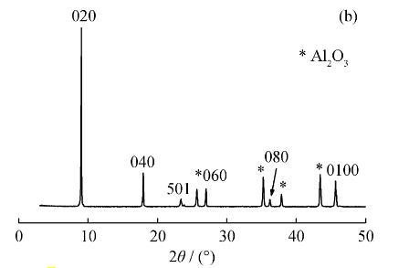 获得高度b-轴取向的晶种层,是采用二次生长法制备b-轴取向的ZSM-5分子筛膜的关键。图1为以LB法在α-Al2O3载体表面组装的Silicalite-1型分子筛晶种层SEM照片和其XRD谱。由图1(a)可见,合成的Silicalite-1分子筛晶粒呈苯环状,粒径分布均匀,大小约为1μm,且表面几乎没有孪晶生成。使用LB技术在α-Al2O3载体上组装的单层Silicalite-1晶种层,连续致密。由图1(b)可知,在5°~50°衍射范围,除去α-Al2O3载体的特征峰,在9.02°(020)、17.94°(040)、26.98(060)、36.22°(080)和45.68°(0100)处均出现了高强度b-轴取向(0k0)晶面特征衍射峰,计算得到的晶体优先取向值KCPO(0k0)=0.93。因此,采用LB法制备的Silicalite-1晶粒层高度致密且呈b-轴取向。