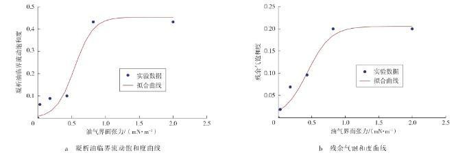 图3凝析油临界流动饱和度、残余气饱和度随界面张力变化的回归曲线