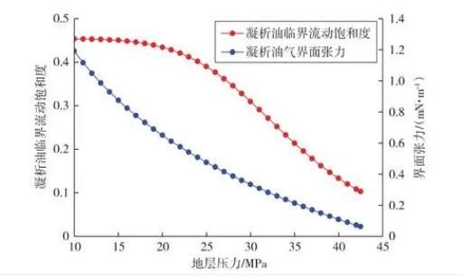 图4凝析油临界流动饱和度和界面张力随压力的变化