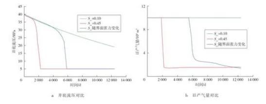 设计机理模型和数值模拟方案,建立组分模型分析变凝析油气临界流动饱和度对开发指标预测的影响,模型网格为50×50×7,渗透率为10×10-3μm2,孔隙度为15%,地质储量为10×108m3。设计日产气量为10×104m3,最小井底流压为5 MPa,以及Scc=0.10、Scc随界面张力变化及Scc=0.45时,预测凝析油临界流动饱和度及不同方案的生产特征。