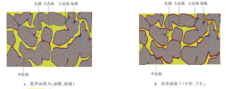 凝析气藏开发过程中伴随着油气界面张力σog的变化,当地层压力高于露点压力时,处于混相状态,油气界面张力接近0 mN/m;当地层压力略低于露点压力时,出现反凝析现象,少量凝析油析出,此时油气界面张力较小,析出的凝析油以油膜状态附着在束缚水之上,即以油膜铺展方式分布于储层中。在曲率较大的孔隙角隅处,由于毛细凝聚作用,以油滴方式分布,凝析油易流动,实验测量的凝析油临界流动饱和度一般小于10%[14](见图1a);随着凝析气藏的开发,当地层压力远低于露点压力时,大量凝析油析出,油气界面张力迅速增加,到最大反凝析压力时的界面张力可比露点压力时的高2个数量级[4]。析出的凝析油大部分以段塞的形式分布于孔隙喉道与角隅,相对于凝析油膜更难以流动,凝析油临界流动饱和度增大(见图1b)。
