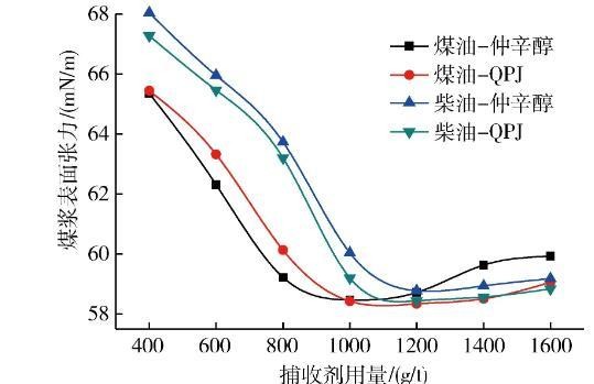 使用柴油做捕收剂时,煤浆表面张力在仲辛醇用量为160 g/t时达到最低值,在超过200 g/t后明显回升;煤浆表面张力在QPJ用量达到160 g/t时达到最低值,在超过160 g/t后回升。由此可见,起泡剂对煤浆的表面张力有着较为显著的影响。