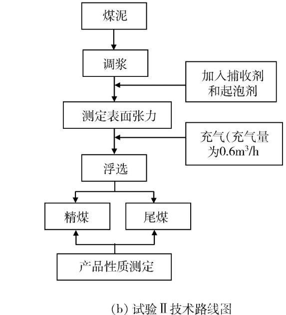 试验分为试验Ⅰ和试验Ⅱ两部分。在试验Ⅰ中,先后改变捕收剂和起泡剂用量,对添加浮选药剂后煤浆的表面张力进行测定,以研究浮选药剂用量对煤浆表面张力影响的规律。在试验Ⅱ中选用煤油/仲辛醇做捕收剂/起泡剂,先后改变煤油和仲辛醇的用量,按照《GB/T 4757-2013煤粉(泥)实验室单元浮选试验方法》对马兰2#煤泥进行浮选试验,并在浮选充气前对煤浆同步进行表面张力的测定,进一步对浮选过程中浮选药剂量、煤浆表面张力及浮选效果之间的关系进行探索。试验控制煤浆浓度为100 g/L,温度为22±0.2℃;使用一次去离子水(pH值为7.0±0.2)。试验技术路线见图1。