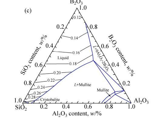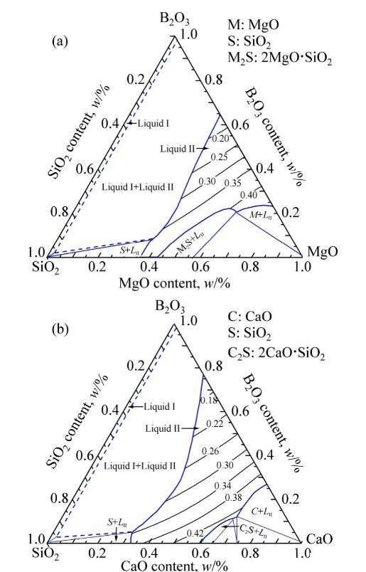 1873K时含B2O3三元体系等温相图及液相线如图4所示。实际条件下,Si常存在于金属相中,而SiO2则以硼硅酸盐的形式存在于熔渣中,因此,SiO2添加对含B2O3三元体系热力学性质的影响仍有待确定,MgO-B2O3-SiO2、CaO-B2O3-SiO2和Al2O3-B2O3-SiO2三元系相图也需要进一步优化。1873K时含B2O3三元体系熔渣等表面张力线如图4所示。结果表明,在MgO-B2O3-SiO2体系和CaO-B2O3-SiO2体系1873K完全液相区(Liquid II)范围内,熔渣表面张力值在0.15~0.45 N/m范围内;随着B2O3含量的增加,表面张力显著降低;随着SiO2含量、MgO含量和CaO含量的增加,熔渣表面张力逐渐增大,但MgO含量和CaO含量对表面张力的影响更加显著。在Al2O3-B2O3-SiO2体系1873K完全液相区(Liquid)范围内,熔渣表面张力在0.10~0.30 N/m范围内;熔渣表面张力随B2O3含量的增加而逐渐减小,随SiO2含量和Al2O3含量的增加而逐渐增大。