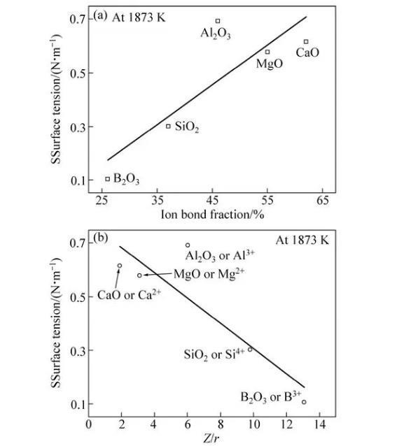 纯氧化物表面张力主要与离子间的键能有关,形成氧化物的离子的静电势(Z/r)大,且离子键分数高的氧化物有较大的表面张力。纯组分氧化物的静电势和离子键分数如图3所示。纯液态B2O3属于表面活性物质,在1873 K时的表面张力约为0.104 N/m,仅为MgO、CaO、Al2O3和SiO2同温度纯物质表面张力数据的1/6~1/3。Si4+和B3+离子虽然静电势很高,但其离子键分数较低(<50%),易形成共价键高、静电势小的络离子,从而其表面张力值较小;Mg2+、Ca2+和Al3+离子虽然静电势较小,但离子键分数较高,从而具有较高的表面张力值。