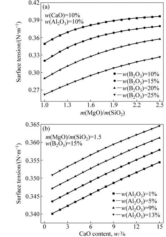 3.4 MgO-B2O3-SiO2-CaO-Al2O3体系中组分含量对熔渣表面张力的影响