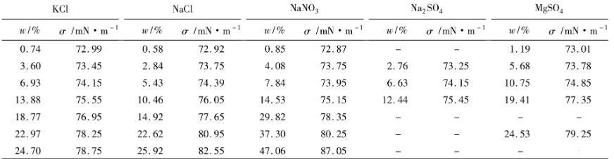 表2 293 K下,无机盐的质量分数与水溶液界面张力的关系