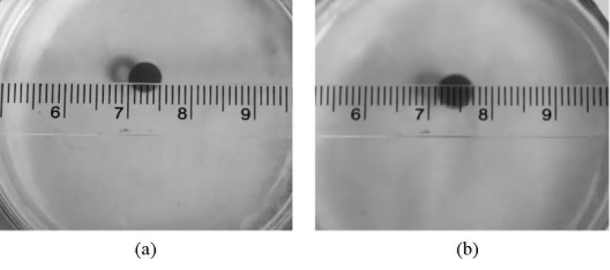 图3油酸在纯水(a)与饱和Na2SO4溶液(b)上形态