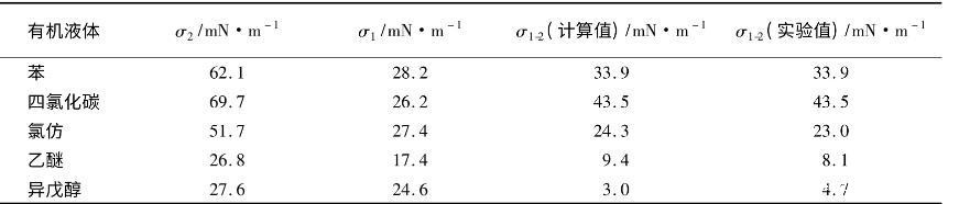 表1给出了几种有机液体(油)与水接触时的界面张力理论计算值和实验测量值的比较。