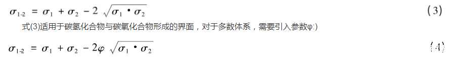 式中φ是与两液体的摩尔体积及分子间相互作用有关的参数。根据经验,φ值一般为0.5~1.5。对于水与脂肪酸、醇、醚、酮接触的体系,其值近似为1;水与饱和烃接触的体系,其值约为0.55;水与芳烃接触体系的值约为0.7。