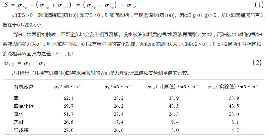 图1中液体表面存在界面张力[5-6],其值的大小是物质分子间相互作用的一种反映,与物质的本性有关。在常见纯液体中,水的界面张力最高,25℃时为72.0mN·m-1,极性有机物液体的界面张力大多低于50mN·m-1,非极性有机液体的界面张力一般更小[7]。由此可知,气/水界面张力大于气/油界面张力,即σ2-g>σ1-g。根据铺展系数(S)的定义: