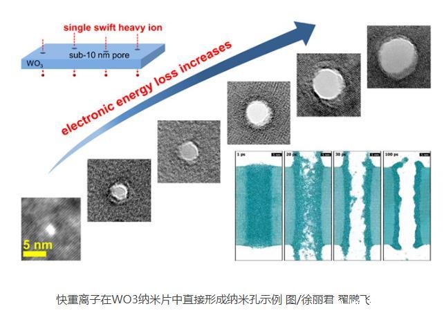 科研人员基于兰州重离子研究装置(HIRFL),利用快重离子作用于WO3纳米片材料,实现了直接“打孔”的制备方法。同时,科研人员利用分子动力学模拟对物理机理进行解释,发现重离子在材料中的沉积能量会引起材料局域瞬时熔融喷发,以及熔融相的粘度和表面张力大小是决定纳米孔形成的关键因素。